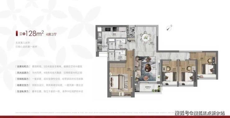 建面128平四房两卫,五开间朝南,客厅直出阳台,四个卧室非阳台报建,收楼后不用自己改造