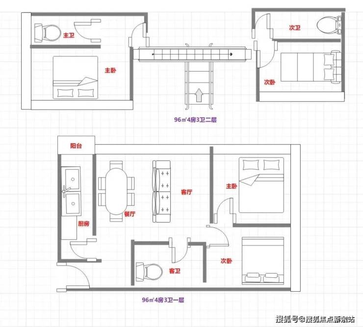 96㎡4房3卫