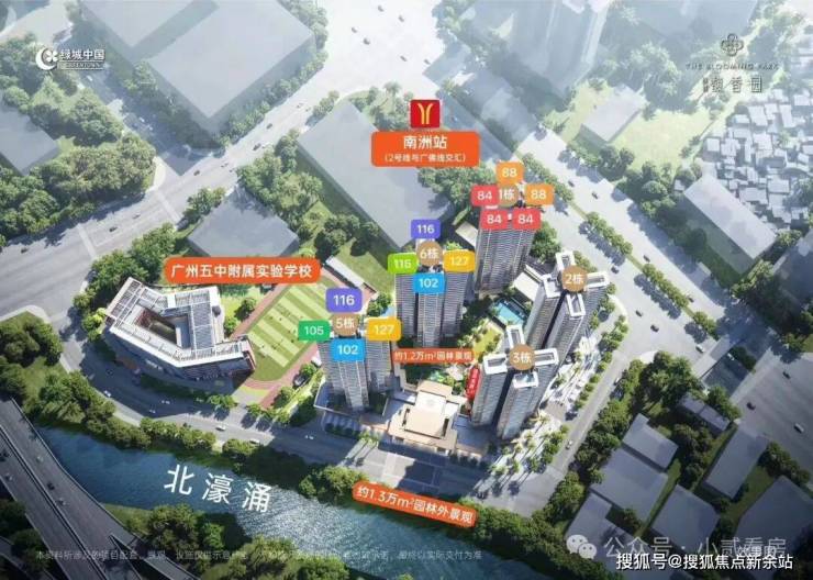 从外部来看,项目背靠河涌,打造了一个滨河公园,与周边的海珠儿童公园、海珠湖、海珠国家湿地等,形成了巨大的天然的生态背景板。