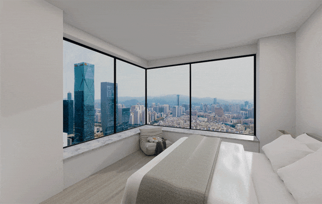 主卧套房借鉴140平户型思路,单边位+卧卫错开,并引入270°环幕景观,窗外繁华城景尽收眼底。