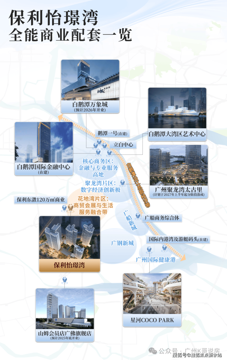 项目自身规划约40万㎡四大滨水商业街区,约700米处万科规划有18万㎡的理想花地商业,周边现有的有芳和荟购物广场,荔胜广百等商圈。
