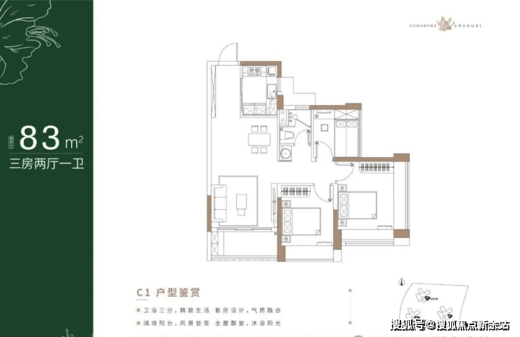 83㎡的3房2厅1卫,设计的是经典竖厅格局,客厅实测3.26米开间,LDKB一体化设计,进门入户玄关,三开间朝南,3个卧室分别做到主卧14.05m²/次卧9.25m²/次卧5.3m²(实测面积),主卧270°转角飘窗,U型厨房,卫生间三段式分离,得房率:76.44%(不含赠送),西南或东南朝向。