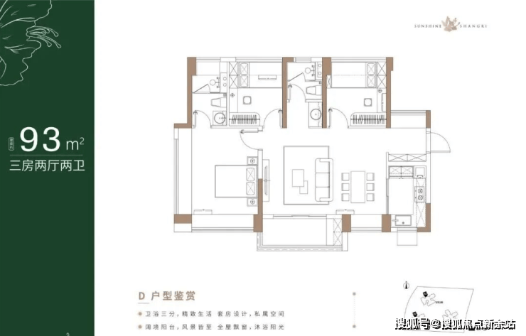 93㎡的3房2厅2卫,1/3栋的02户型,设计的是横厅南北通透格局,客餐厅5.8米开间,LDK一体化设计,3个卧室分别做到了3.2米/2.9米/2.5米的宽度,主卧270°转角飘窗,U型厨房,公卫三段式分离,得房率:76.44%(不含赠送),阳台主朝西南向。