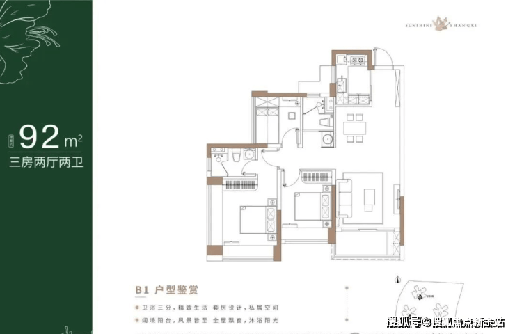 92㎡的3房2厅2卫,设计的是经典竖厅格局,客厅实测3.25米开间,LDKB一体化设计,三开间朝南,3个卧室分别做到主卧15.32m²/次卧9.15m²/次卧5.57m²(实测面积),主卧270°转角飘窗,L型厨房,公卫三段式分离,得房率:76.44%(不含赠送),西南或东南朝向。