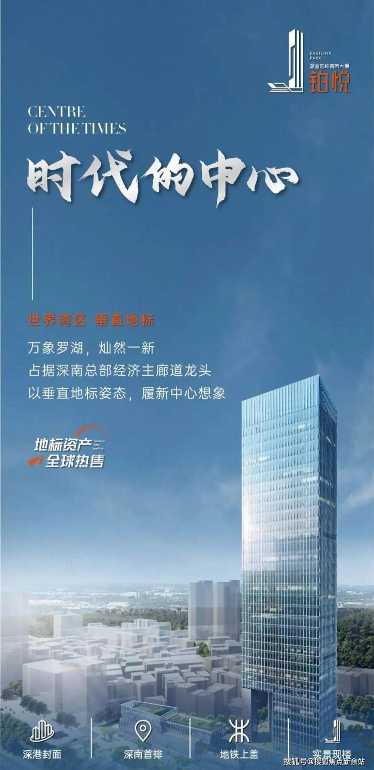 【深业东岭·铂悦】深业东岭商务大厦整体销售政策∶① 办公:位于17-36层,342套,整体面积约27767.36㎡,单层面积约1460㎡,标准层高4.2米,可按2层购买,整体售价9.7亿,单价3.49万/㎡② 酒店塔楼商业:位于5-16层,284套,整体面积约14793.5㎡,按套分证,标准层高3.3米整体售价4.97亿,单价3.38万/㎡③ 裙楼商业:位于B1-4层,76套整体面积约13053㎡,整体售价6.34亿,单价4.88万/㎡④ 整栋:702套,总建面约75664.16㎡(含地下停车场及其他公共区域),计容面积约55612.68 ㎡,整体价格21亿,单价3.78万/㎡罗湖之芯·深南大道首排三地铁接驳·三口岸环绕约7.6万㎡奢尚都会综合体办公·商业等多元业态深港互融·大道资产·启幕在即