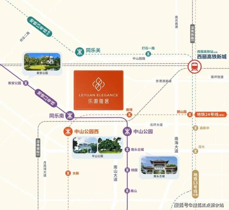 12号线同乐南站(直线约500m),1站中山公园,2站到西丽高铁站(在建中),4站到科技园,5站到前海;
