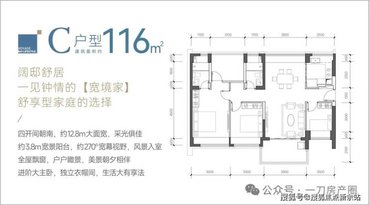 116㎡的4房2厅2卫,C户型,设计的是竖厅南北通透格局,餐客厅一体化设计,客厅3.8米开间,四开间朝南,4个卧室分别做到了主卧17.85㎡/次卧11.4㎡/次卧9.3㎡/次卧8㎡(包含墙体飘窗),都不用搭配飘窗做床,U型厨房,卫生间干湿分离,阳台主朝西南、东南或正南向。