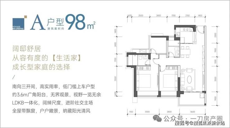 98㎡的3房2厅2卫,设计的是经典竖厅格局,LDKB一体化设计,客厅3.6米开间,三开间朝南,动静分区,3个卧室分别做到了主卧13.69㎡/次卧11.62㎡/次卧5.76㎡(包含墙体飘窗),都不用搭配飘窗做床,L型厨房,卫生间干湿分离,西南、东南或正南朝向。
