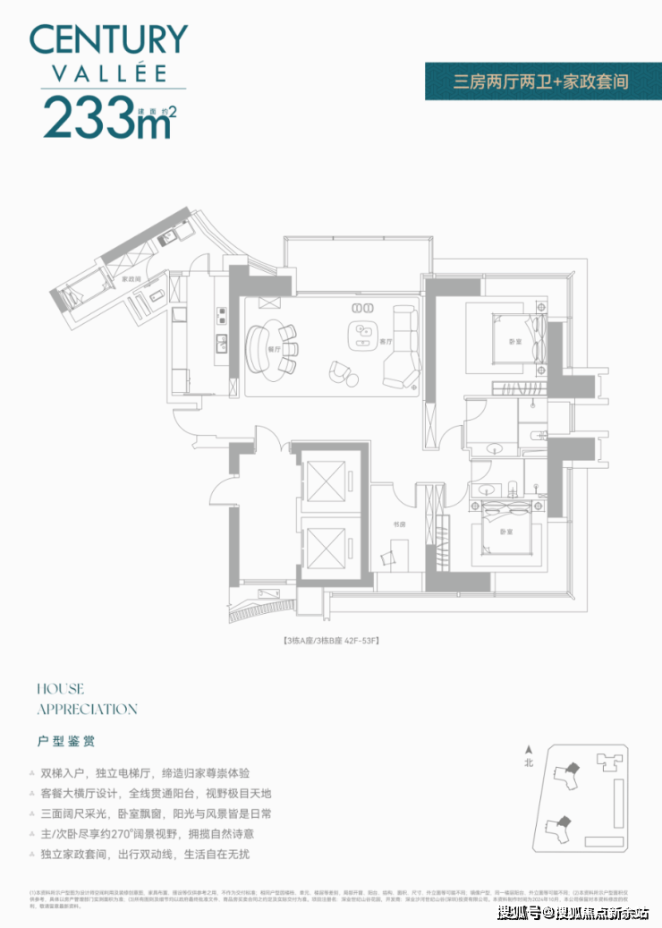 约233㎡3+1房3卫 A户型,西北朝向看名商和沙河高尔夫;