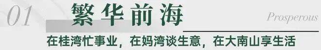 大南山生态住区项目所在前海合作区大、小南山片区西组团规划定位重点安排教育际金融城和【妈湾】深港国际服务城两大前海核心区引擎形成前海黄金三角,工作、生意生活尽在掌握山海通廊:约650米两个红绿灯,咫尺2.9k㎡妈湾理想城市约 53.8 公顷绿地公共空间,营造全域公园城市,宜业宜居的绿色人文之城