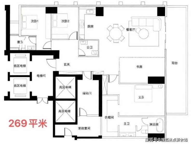 户型面积布局2269平四房两厅三卫户型大气,同样为四房三卫设计。带有 “X - SPACE”,可根据需求打造专属功能区。餐厅与客厅相连,营造出阔绰的公共活动空间,搭配大阳台,采光与通风效果佳,能为生活增添更多惬意场景。卧室布局合理,主卧等空间宽敞舒适,还设有珍宝室,方便收纳珍藏物品,尽显品质感。