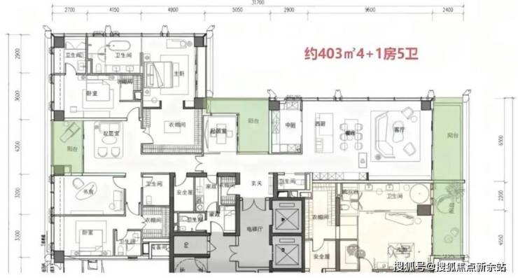 户型面积布局7403平五房两厅五卫空间灵动且实用。多个阳台分布,能充分引入自然光线与风景。卧室部分,主卧及次卧等均有良好的空间感,还设有收藏室等特色空间,满足收纳与兴趣展示需求。中厨、西厨分离,烹饪与社交场景可灵活切换,提升生活品质。