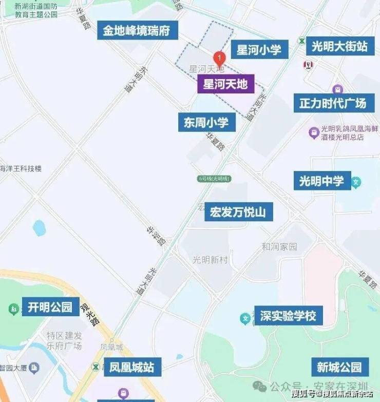 星河天地位于光明CBD,临近6号线光明大街站,一站到达凤凰城,地铁通勤便利,周边还有在建的13号线北延线及6号线支线。