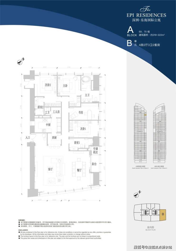 A座69—70层B单位,建面约319-322㎡,4房2厅3卫2套房