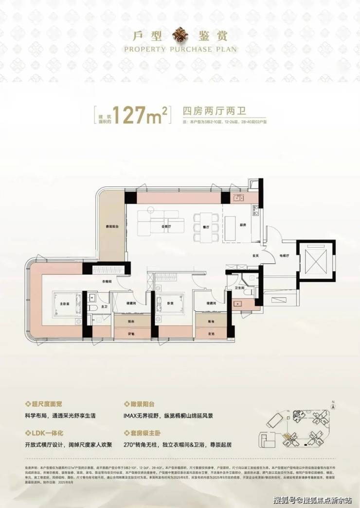 127㎡的4房2厅2卫,设计的是竖厅格局,尊享独立电梯入户,LDKB一体化设计,动静分区,六开间朝南,主卧270°无柱转角全景舱,L型厨房+岛台设计,卫生间干湿分离,得房率约105%(包含赠送),西北朝向看一线梧桐山景观。