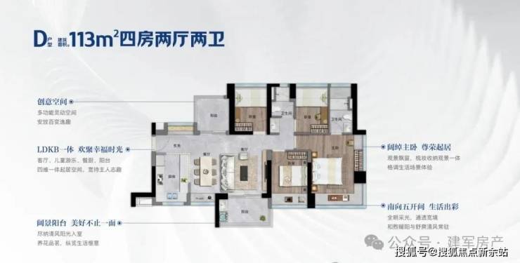 113㎡的4房2厅2卫,1栋1/2单元07户型,设计的是横厅南北通透格局,进门入户玄关,客厅5.4米开间,LDKB一体化设计,五开间朝南,南北双阳台也可以改5房,U型厨房,公卫三段式分离,得房率约75.9-76.6%(不含赠送),阳台主朝西南或东南向。