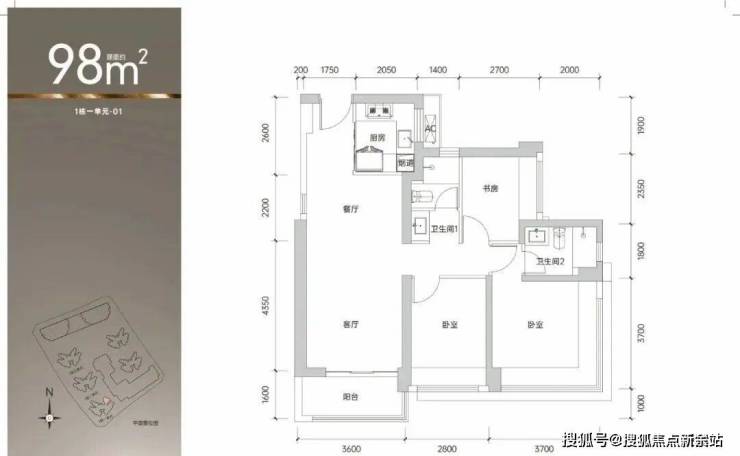 98㎡的3房2厅2卫,1栋1单元01户型,设计的是经典竖厅格局,客厅3.6米开间,3个卧室分别做到了主卧14.3㎡/次卧10.36㎡/次卧6.75㎡(包含墙体飘窗),得房率约90%(包含赠送),东北朝向。