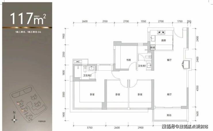 117㎡的4房2厅2卫,1栋2/3单元06户型,设计的是经典竖厅格局,客厅4米开间,四开间朝南,动静分区,4个卧室分别做到了主卧16.5㎡/次卧9.57㎡/次卧8.58㎡/次卧7.97㎡(包含墙体飘窗),得房率约90%(包含赠送),东南或西南朝向。