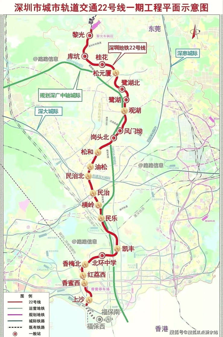 22号线鹭湖站在建,始于龙华黎光站,途经龙岗区,终于福田上沙站,开通后到福田仅需45分钟。