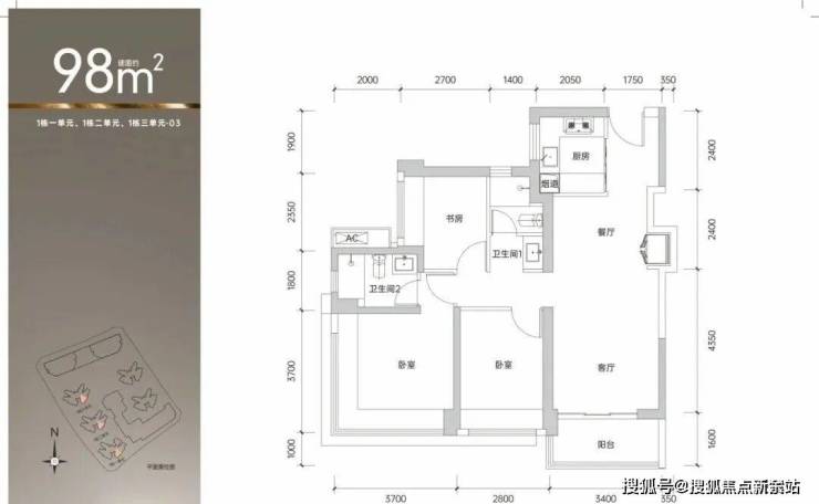 98㎡的3房2厅2卫,1栋1/2/3单元03.05户型,设计的是经典竖厅格局,客厅3.4米开间,三开间朝南,3个卧室分别做到了主卧14.3㎡/次卧10.36㎡/次卧6.75㎡(包含墙体飘窗),得房率约90%(包含赠送),东南或西南朝向。