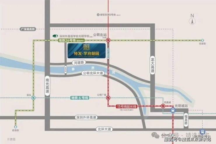 项目距13号线二期(北延)公明北站直线距离约200米,4站达公明广场,可换乘6号线通达宝安/光明/龙华/罗湖/福田