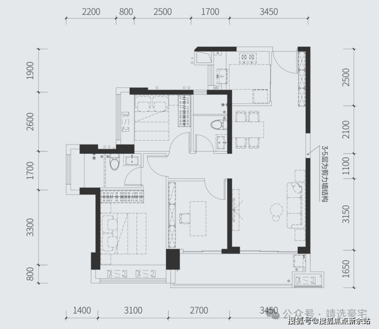 建面约97㎡三房两厅两卫