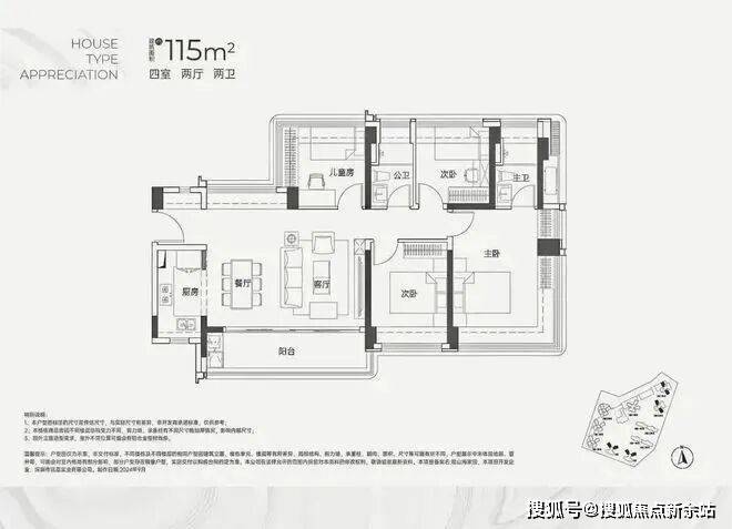 面积约为115㎡的4房2卫户型,提供了东南、西南以及西北三种朝向选择,共计三种不同的格局。尽管这些格局在整体布局上相似,都采用了横厅设计,且阳台空间宽敞,但它们之间的主要差异在于阳台的设计上。这种设计上的微妙变化,无疑是为了更好地适应楼栋的朝向和周边景观而做出的精心调整。