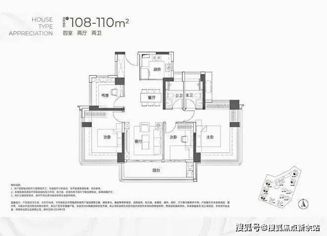面积约为108-110㎡的4房2卫户型,其设计也颇具匠心。该户型为西南向或东南向,同样采用了传统的竖庭设计,确保了南北通透的居住体验。阳台的设计同样出色,从客厅一直延伸至次卧的对面,使得空间显得格外宽敞。此外,该户型的动线设计也相当清晰,动静分区合理,特别是两个卫生间紧密相邻,为居住者带来了极大的便利。
