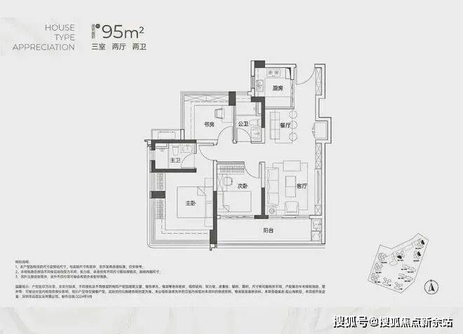 面积约95㎡的3房2卫户型,以西南向或东北向的山景为特色,采用传统的竖庭设计,确保了南北通透的居住体验。特别值得一提的是,其阳台设计巧妙,从客厅延伸至次卧,使得空间显得格外宽敞,非常适合三代同堂的家庭,尤其是方便了老人早间的锻炼活动。