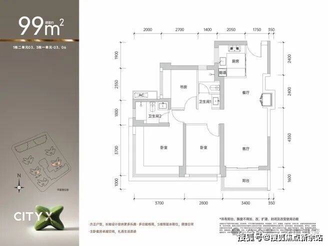 建筑面积约99㎡的3房2卫02/03/05/06户型:全南向爆款空间