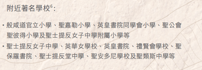 【校网】:小学11校网及中西区中学校网,皆为全港数一数二的名牌校网,区内有多所老牌学府,孕育出不少社会杰出人才,同时距离香港大学仅一站之隔,令不少家长趋之若鹜。