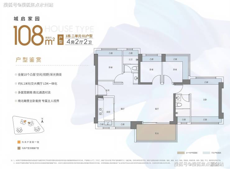 108㎡的4房2厅2卫,设计的是横厅南北通透格局,进门独立玄关,客餐厅6.4米开间,LDKB一体化,五开间朝南,主卧双飘窗通透设计,全屋10个凸窗,4个卧室分别做到了主卧17.01㎡/次卧9.7㎡/次卧8.4㎡/次卧7.35㎡(包含墙体飘窗),L型厨房,卫生间干湿分离,得房率约91.88%(包含赠送),阳台主朝西南或东南向。