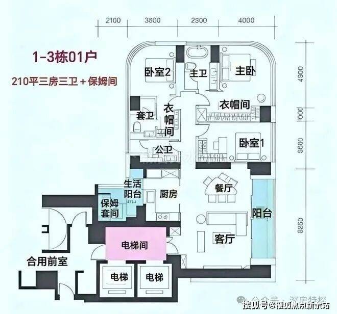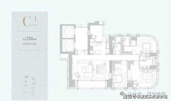 每户都是专梯入户+入户空间。C栋位于小区最里面,东南向户型(218㎡01)会被A、B栋遮挡。