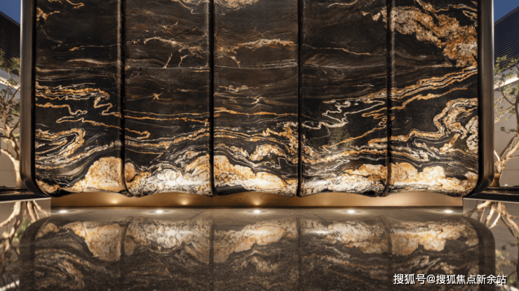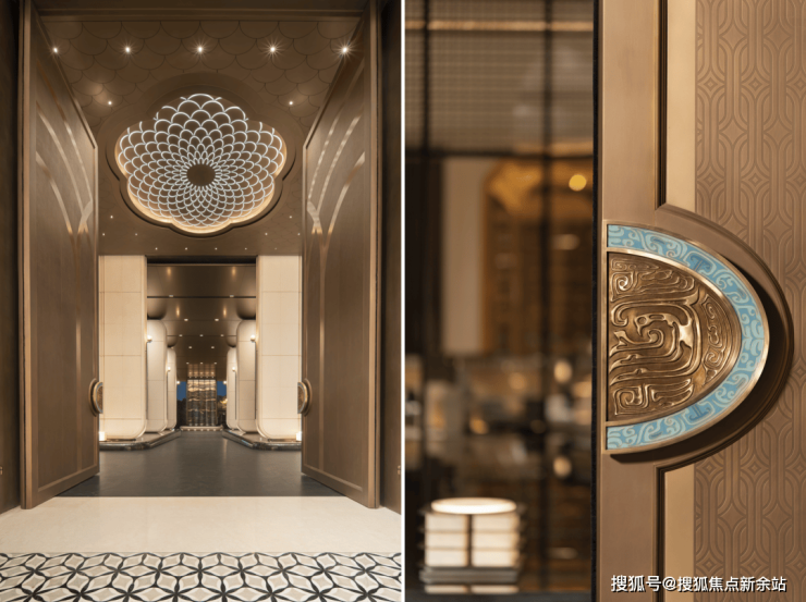 二进院“水境回廊”,将令人惊叹的“文化浓度”融于空间。六扇瑞兽纹墙以岭南剪纸工艺呈现,象征“六合天地”;两吨重约7.5米高鎏金铜门,由非遗大师朱炳仁锻造。