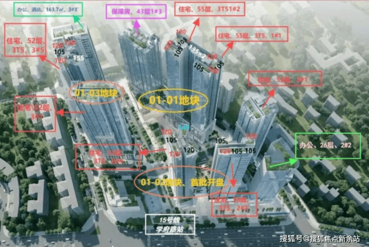 02地块占地约1.4万㎡,建面约17.3万㎡,规划4栋建筑(3栋住宅51-53层+1栋办公27层)。住宅8.4万㎡(872户),商业1万㎡,办公1.7万㎡,车位747个。