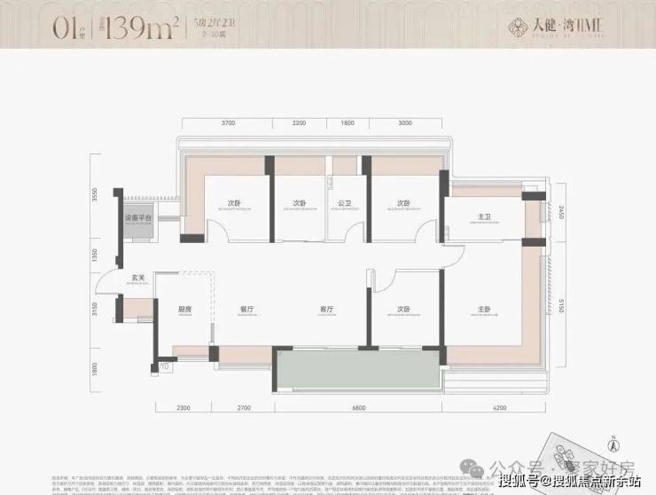 139㎡5房2卫,竖厅户型,朝南看海,户型结构和115接近,多了一间朝南卧室,主卫做了双面凸窗;