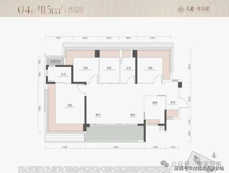 115㎡4房2卫,横厅户型,朝南看海,入户独立玄关,但三个次卧朝北;