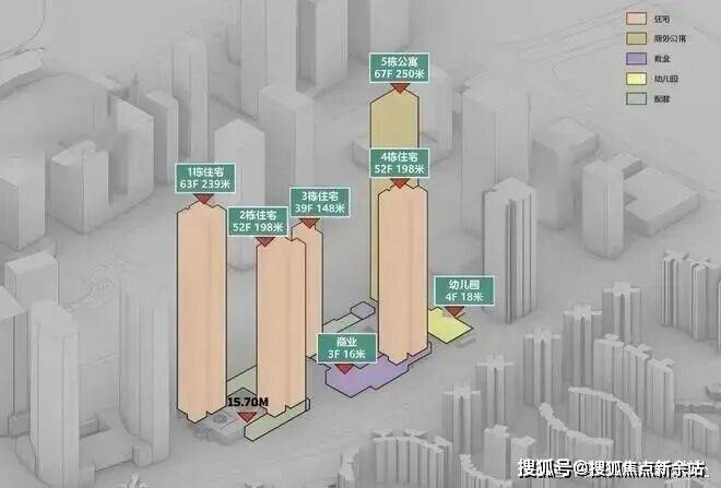 1栋公寓250米,4栋住宅分别150米、200米、200米、240米。层高3.3米,约40-70层(不含底商)