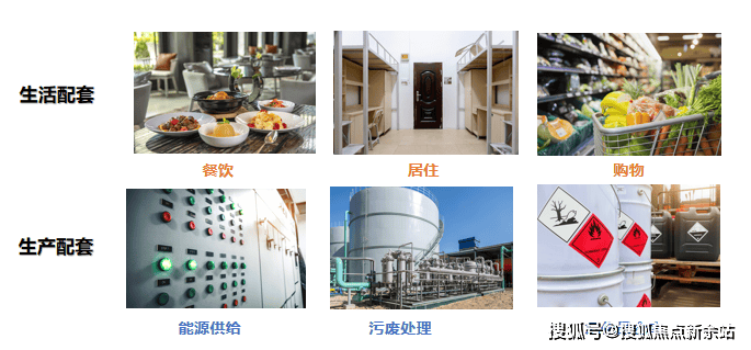 1.生活配套:配套公寓、酒店4.6万㎡,餐饮、超市、社区饭堂1.4万㎡,路演、政务、托管0.4万㎡,为各类生产生活提供便利。