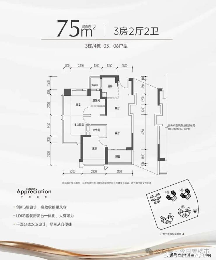 一共8条腿,选择比较丰富。70-80平户型在市面上有楼盘在售,但基本为3房1卫或2房1卫,溪山禾玺基于新规设计优势,75平直接升级为3房2卫,具备功能全的同时还压低了总价。