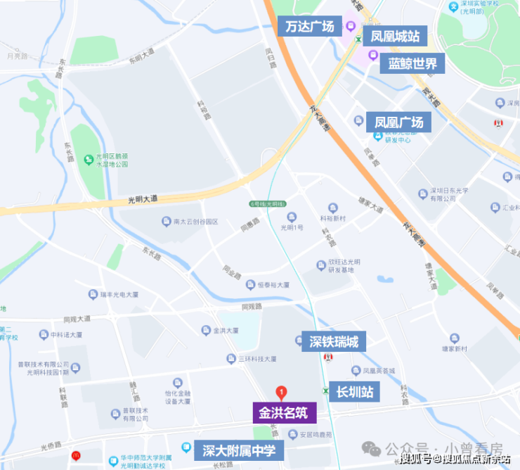 金洪名筑位于光明区凤凰街道,光侨路与东长路交汇处东北侧,距离地铁6号线长圳站约200米,紧邻深铁瑞城,东侧为长圳地铁站,北侧为深圳中学光明科学城学校。