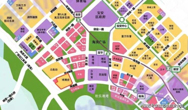 华润招商观潮府位于深圳市宝安区宝安中心区金科路与海天路交汇处南侧,是宝安中心区南街坊地块(宗地号A002-0108)。项目于2025年8月15日由华润+招商以86.4亿元竞得,为2025年深圳总价地王,溢价率34.8%,楼面价约5.96万/㎡。