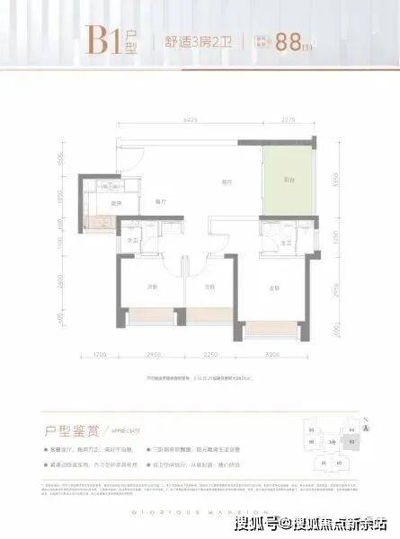 88㎡的3房2厅2卫,1栋A座06户型,竖厅格局,LDKB一体化设计,动静分区,三个卧室都朝南向,U型厨房,公卫三段式分离,阳台正东朝向。
