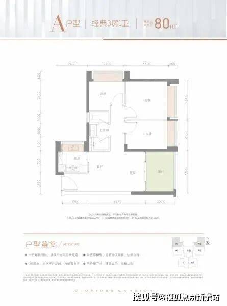 80㎡的3房2厅1卫,1栋A座04/05户型,竖厅格局,LDKB一体化,动静分区,次卧双飘窗设计,U型厨房,卫生间干湿分离,阳台朝正西或正东向。