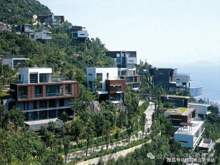 别墅组群的规划充分利用基地本身沿山登高线迂回弯曲的地形及由高而下的天然山势,以高低错落有序的几何形体组合创作出一个富有现代感的山地建筑群。
