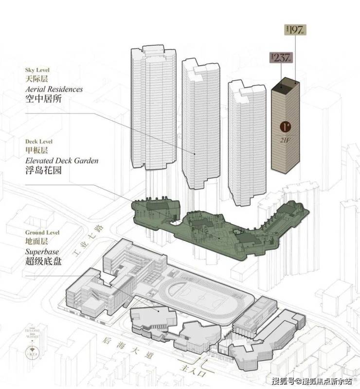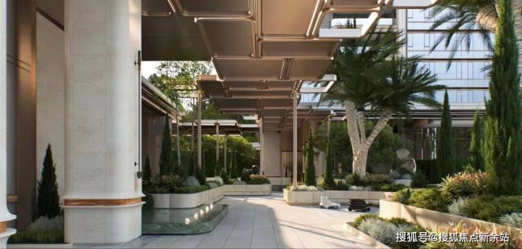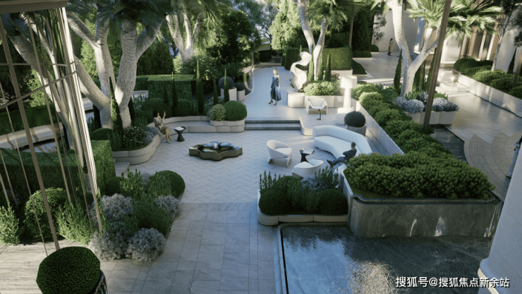利用裙房屋顶打造拥有“仪式水轴“艺术庭院”“空中浮岛森林”三级景观设计的空中庭院,四栋住宅均漂浮于甲板之上,独享甲板庭院花园,以“海风吹拂下的豪宅底盘”托举城市上空的豪宅群落,形成立体景观系统。