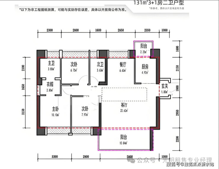 127㎡三房两卫,东南朝向,客厅面宽5.6米,阳台进深2.2米