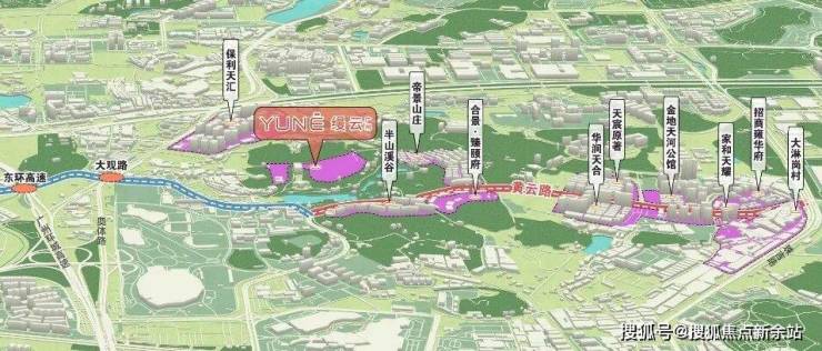 环境方面,整个项目建在一个小山包上,周边就是天河智谷板块,也有山体公园,南面是往日的世界大观游乐园,这里最不缺的就是树,现场航拍也能看到周边茂密的森林。