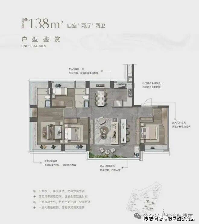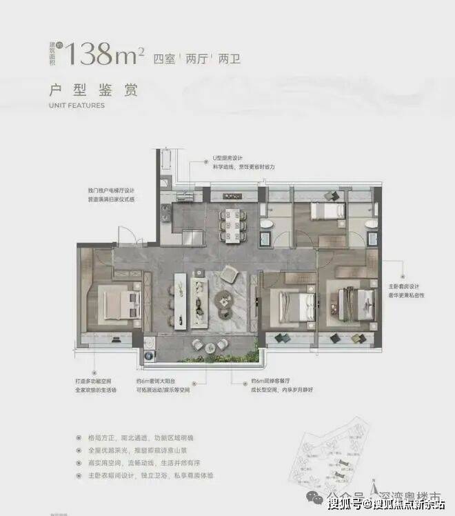 入户玄关巧妙隔绝视线,隐私感拉满。客餐厅南北通透,大客厅除传统布局外,还增设茶台区域,两者共享 6 米多宽景阳台,搭配 U 型厨房与方正餐厅,公区气场全开。