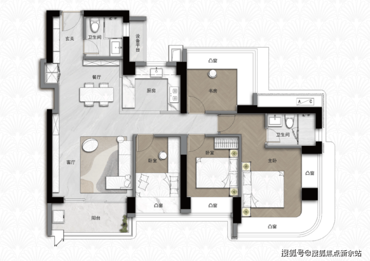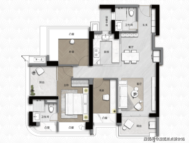 123/126㎡四房两厅两卫:南北通透,约 4.2 米宽厅,LDKB 一体化设计;四开间朝南,六大凸窗 + 设备平台;主卧套房带独立卫浴与 270° 飘窗,适合三代同堂的改善家庭。